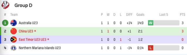 本轮过后,澳大利亚和中国U22男足都积3分,但澳大利亚队以13个净胜球优势暂列本组头名。东帝汶和北马里亚纳群岛队同积0分,排名小组第3和第4位。